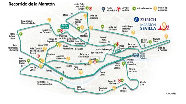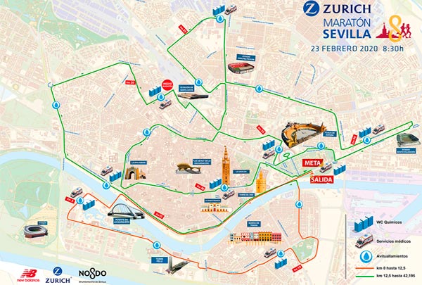 Recorrido maraton sevilla 2019. Durante el recorrido del Zurich Maratn de Sevilla 2019 se habilitarn 16 puntos de avituallamientos en los que se suministrar a los corredores de agua en vasos de papel reciclado bebida isotnica en botellas de plstico geles esponjas y slidos. Cortes de trfico por el Maratn de Sevilla. As es el recorrido de la Zurich Maratn de Sevilla 2019 Detalles y puntos de inters del circuito de algo ms de 42 kilmetros que ofrece un completo paseo al corredor por la ciudad SI.